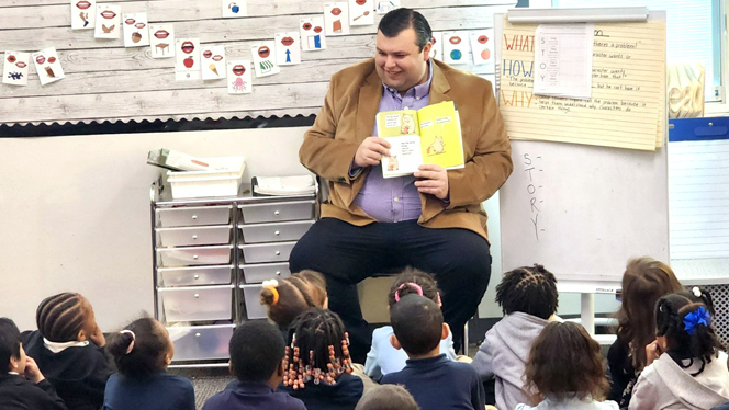 WOOD-TV meteorologist Matt Kirkwood reads to scholars at Walker Charter Academy.