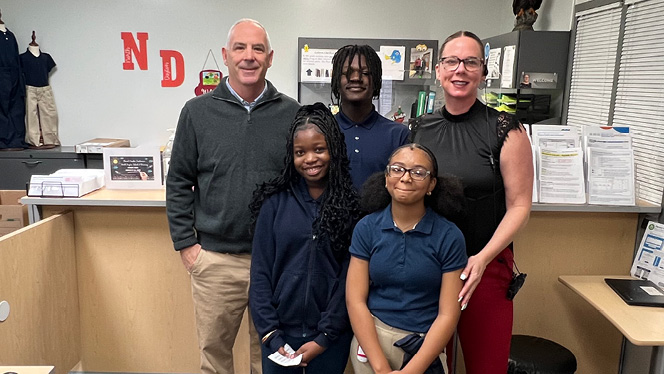 Ohio State Senator Steve Huffman (back left) visits with North Dayton School of Discovery principal Victoria Simmons (back right) and scholars Marquinn Blake (back row, middle), Addison Bennett-Crowder (front row, right), and Joyce Espoir (front row, left).