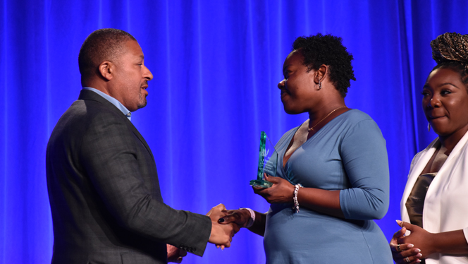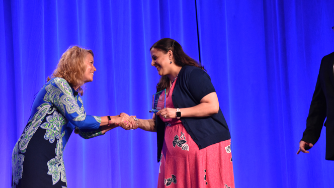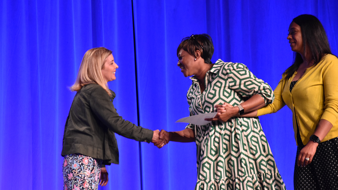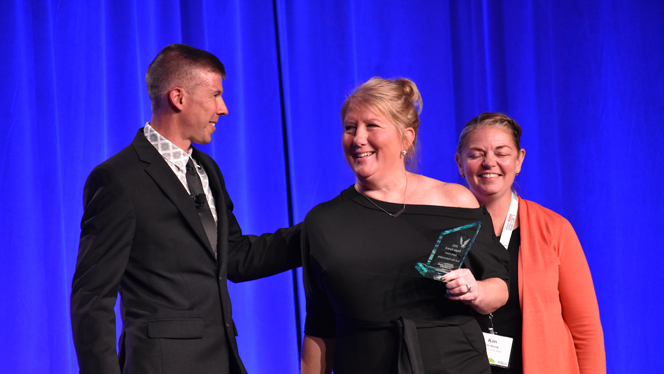 NHA Chief People Officer Thea Reigler congratulates new Pembroke Principal Salwa Kinsey on her team’s award for Employee Engagement during the Eagle Awards ceremony.