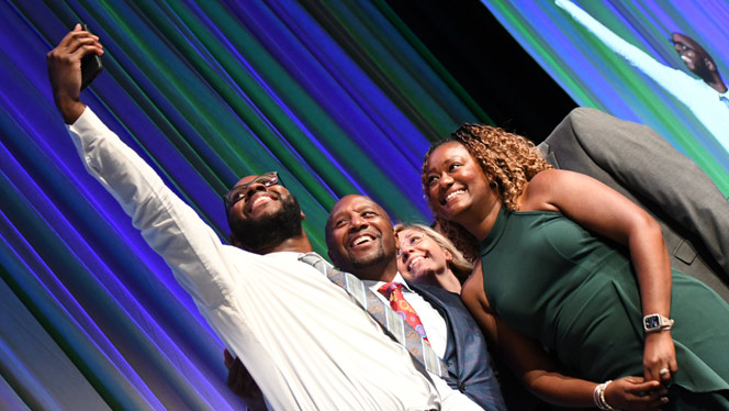 Leaders from Westfield Preparatory High School (from left to right: Principal Kurtis Dollison, Dean Samantha Lynch, and Dean Keyheatia Walker) pose for a selfie with Executive Director of School Quality Shawn Leonard (second from left) after receiving an Eagle Award.