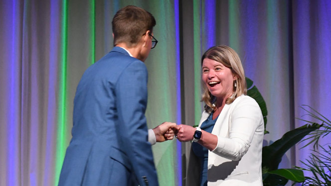 NHA President and Chief Learning Officer Nick Sheltrown (left) congratulates Canton Charter Academy Principal Jennifer Conley during the Eagle Awards at the 2024 Leadership Summit.
