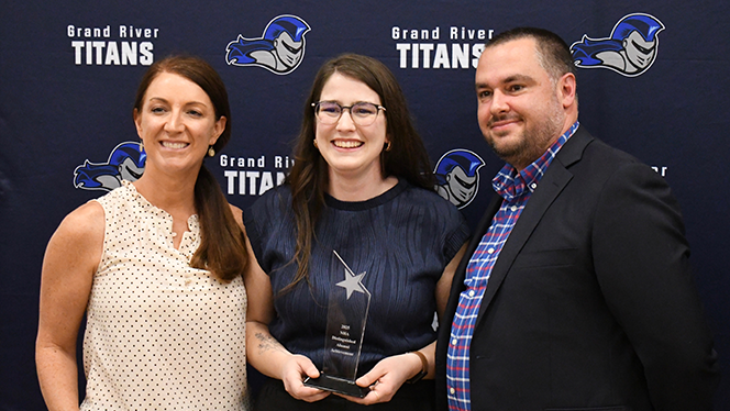 From left: DSQ Koree Woodward, Grand River Prep alum Abigail Steinmeier, and Grand River Prep Principal Mike Irwin pose for a photo after the event.