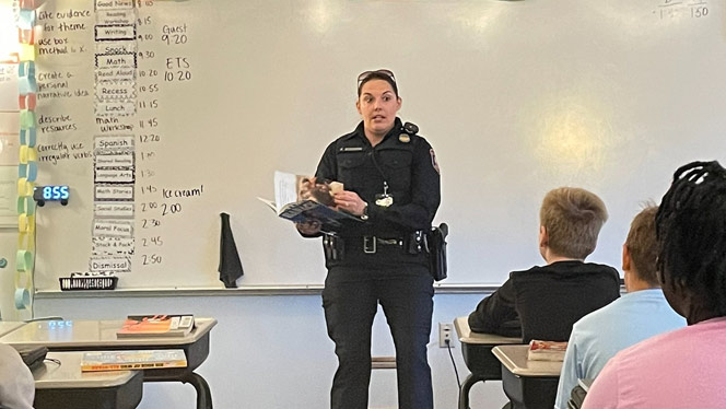 Grand Rapids Police Department Officer Bernardo reads to scholars during their visit to Excel as a part of Safe Schools Week.