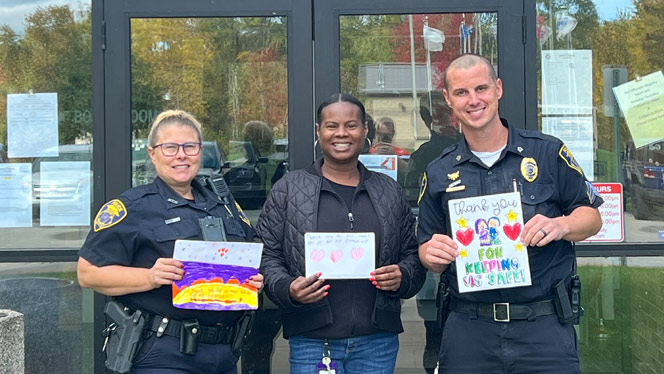 Timberland principal Dr. Berretta Herard (middle) gives thank you cards to the Muskegon Township Police Department.