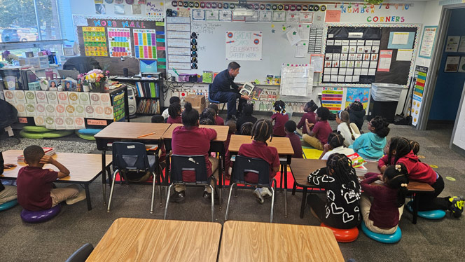 A member of the Warren Fire Department reads to scholars at Great Oaks Academy while visiting the school for Safe Schools Week.