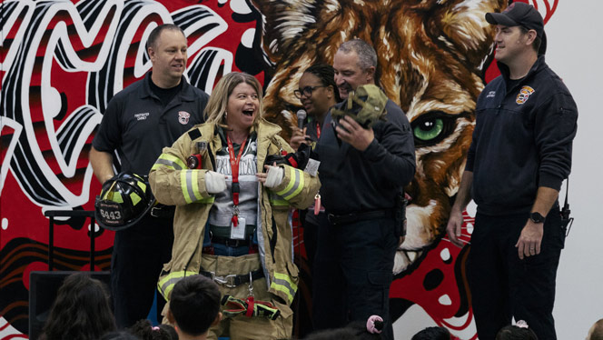Some of Canton’s youngest scholars expressed their gratitude for first responders by making thank you cards. The Canton Police Department and Fire Department gave scholars a presentation and put principal Jennifer Conley in a firefighter’s shoes, literally. After Principal Conley donned a full fire suit, scholars did a walkthrough of a fire truck.