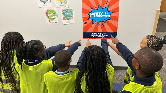 Scholars at Prevail Academy point to a poster for Safe Schools Week. This year’s them is Safety is a Superpower.