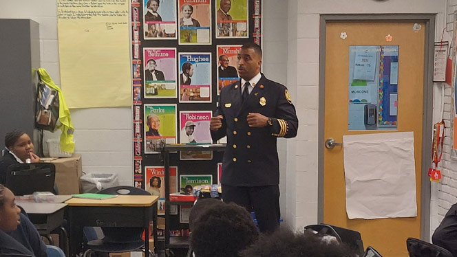 City of Detroit Fire Department Chief James Harris speaks with students at Regent Park Scholars about how they can prioritize safety.