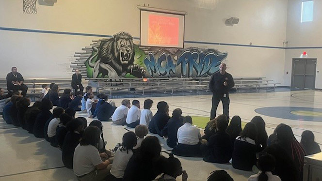 Safety Man speaks with scholars at Summerfield Charter Academy for Safe Schools Week.