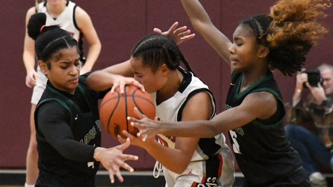 Autumn Pernell and Taylor Wallace guard a Lowell player during their game earlier in the season.