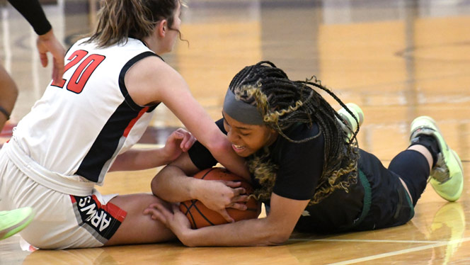 Stacy Utomi grapples for the ball with a Lowell player.“It’s always been a dream of ours to take it to the next level, so to see it to fruition is everything,” she said. “I believe in our team, I think we can do it, but it’s a matter of if we buy-in, which I think we will. The goal and plan is to finish out with the state title.”