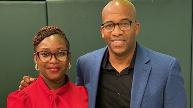 Brooklyn Scholars Principal Roxanne Thomas poses with Real Dads Network Founder Derek Phillips.