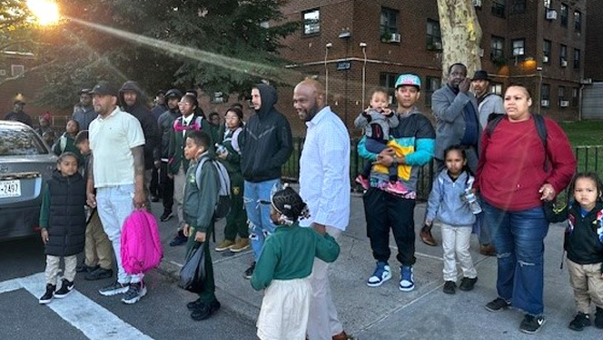 Children across New York City were accompanied to school by their fathers to show the importance of having positive male role models present in the lives of children. Students from Brooklyn Scholars Charter School participated in the Dads Take Your Child to School Day by eating breakfast with their fathers, grandfathers, and other father figures at Pink Houses Community Center before walking in a large group to their school for the day.