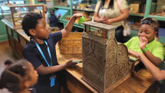 K-8 School in Detroit: Detroit Premier lower elementary students use a cash register.