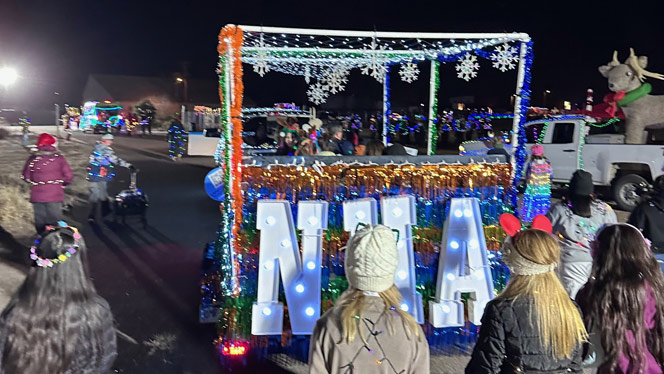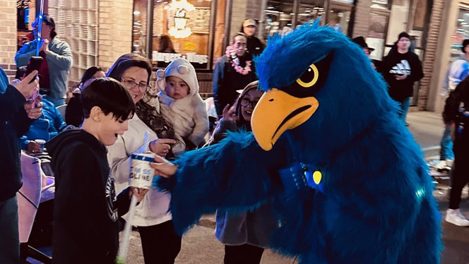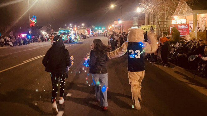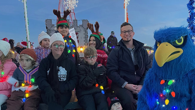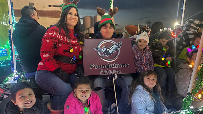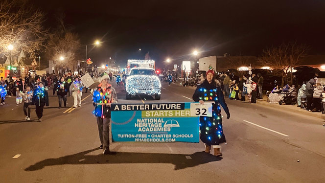 Families, students, and staff worked together to build a float decorated in NHA colors and covered in holiday lights The schools’ mascots Freddy the Falcon from Foundations and Lenny the Lynx from Landmark joined in, representing the schools along the parade route and spreading holiday cheer.