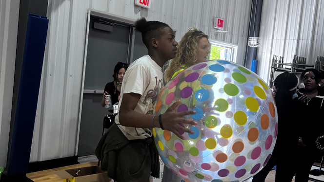 Teens playing with an inflatable ball.