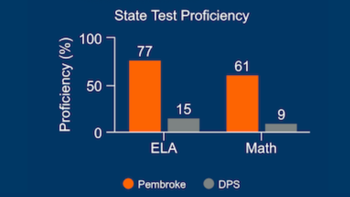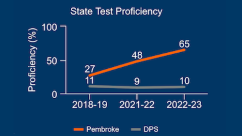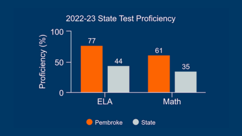 Overall state test proficiency has increased by 38 percentage points since the school's opening in 2018. Pembroke is the only school in the state to have achieved these gains over the past four years.