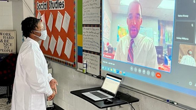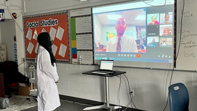 Estime picks schools across southeast Michigan to work with and teach the students about weather and meteorology. When Riebe’s students had questions, they would go to the front of the class so that Estime and the student could see each other better.