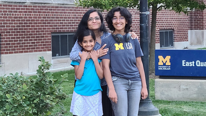 Choudhary (left) comes from a family of spellers. Her sister Pragya (right) competed in the national spelling bee in 2018, and both have a stellar coach in their mother Lalita Mishra (middle).