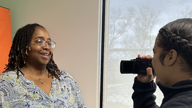 Music teacher Kimberly Jarnegan speaks to the camera as she teaches students the basics of taking video at River City Scholars.