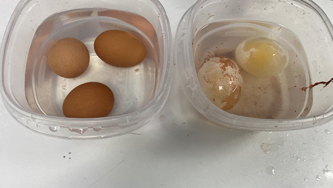 From left: Eggs in normal tap water, and eggs in vinegar.
