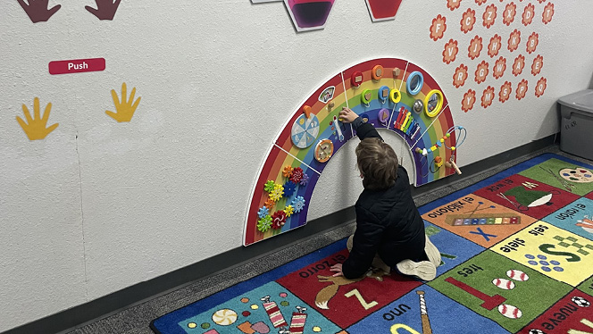 “We have a cabinet in the hall that houses a lot of it and some things are stuck on the areas for them to do activities like push-ups. There's a little panel for them to match different shapes and there's a bulletin board in that area where we put the zones of regulation there so that kids can identify what zone they're in. It's still a work in progress, but we've definitely seen some good benefits to it.”