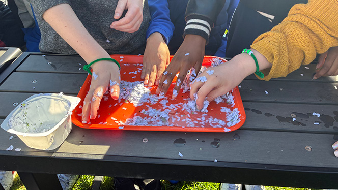 Students from Young 5s to fifth grade took part in an Earth Day Extravaganza on Tuesday with different stations to help bring awareness on protecting and preserving the planet. They made bird feeders that will help them observe critters from the surrounding woods, put together and planted “seed bombs,” and battled in a relay race by gathering recyclable materials.