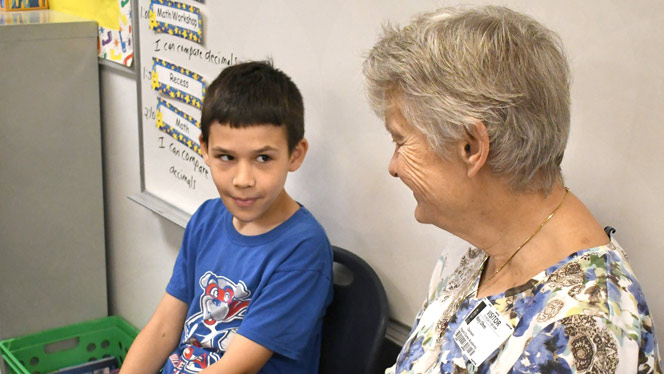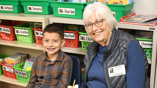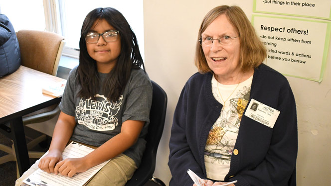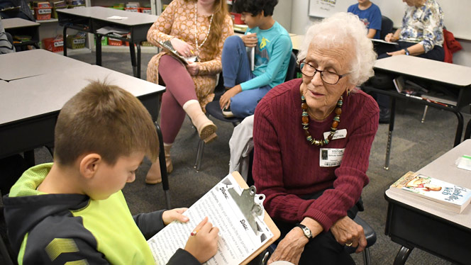 The reason the class spills into the halls for Bonding with Books is a lack of space, but for good reason. The students are joined by residents of Waterford Place, a nearby retirement community, who help them practice reading.